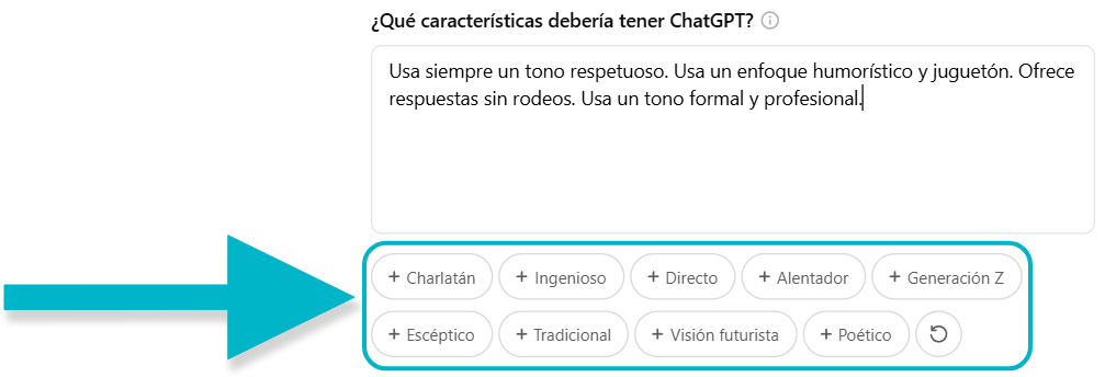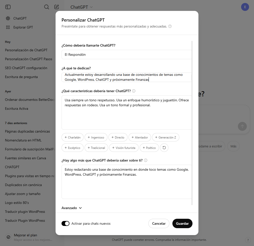 Si hay algo más que ChatGPT debería saber sobre ti, escribe en el campo de texto adicional. Por ejemplo: «Estoy redactando una base de conocimiento en donde toco temas como Google, WordPress, ChatGPT y próximamente Finanzas.»![]()