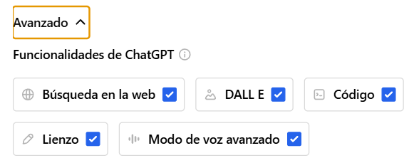 Si deseas habilitar características adicionales como la Búsqueda en la web, DALL·E, Código, Lienzo o Modo de voz avanzado, activa las opciones que más te interesen.