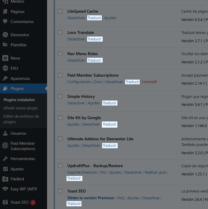 - Da clic en: [Traducir] en el plugin deseado.