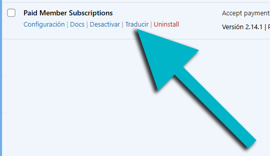 Por ejemplo, supongamos que queremos traducir el plugin Paid Member Subscriptions. Este plugin viene en inglés y no tiene traducción al español, por lo que solo debemos dar clic en la opción [Traducir]: