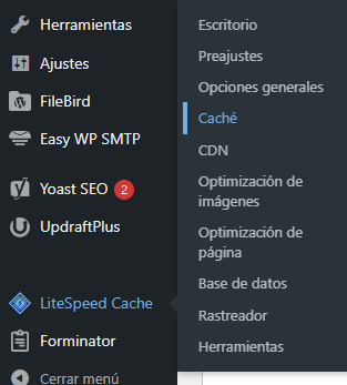 En el menú lateral de WordPress busca LiteSpeed Cache y da clic en la opción Caché.