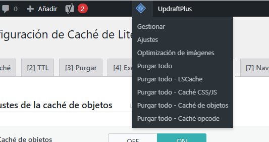 En el menú superior de WordPress, clic en ícono de LiteSpeed Cache → [Purgar todo]